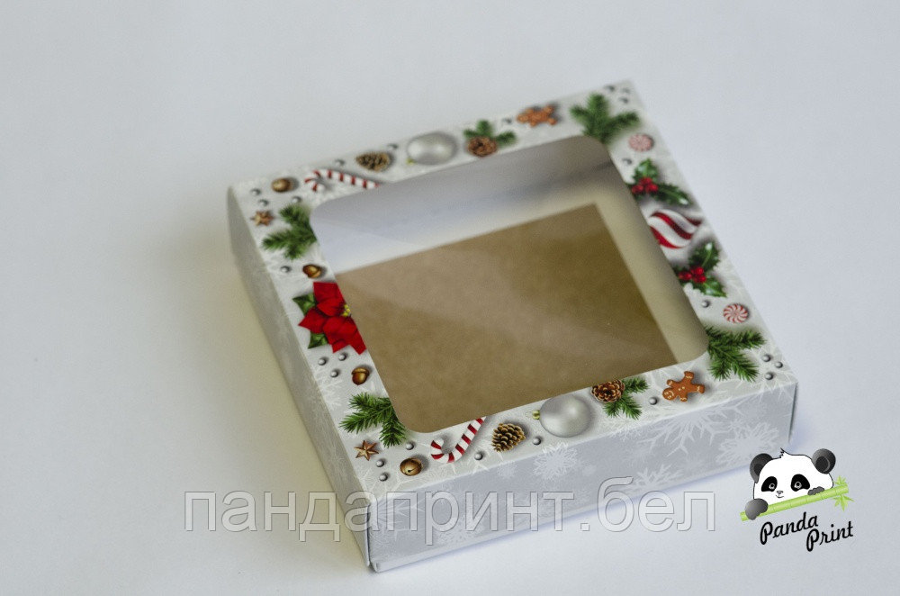 Коробка с прозрачным окном 100х100х30 Новогодняя (белое дно)